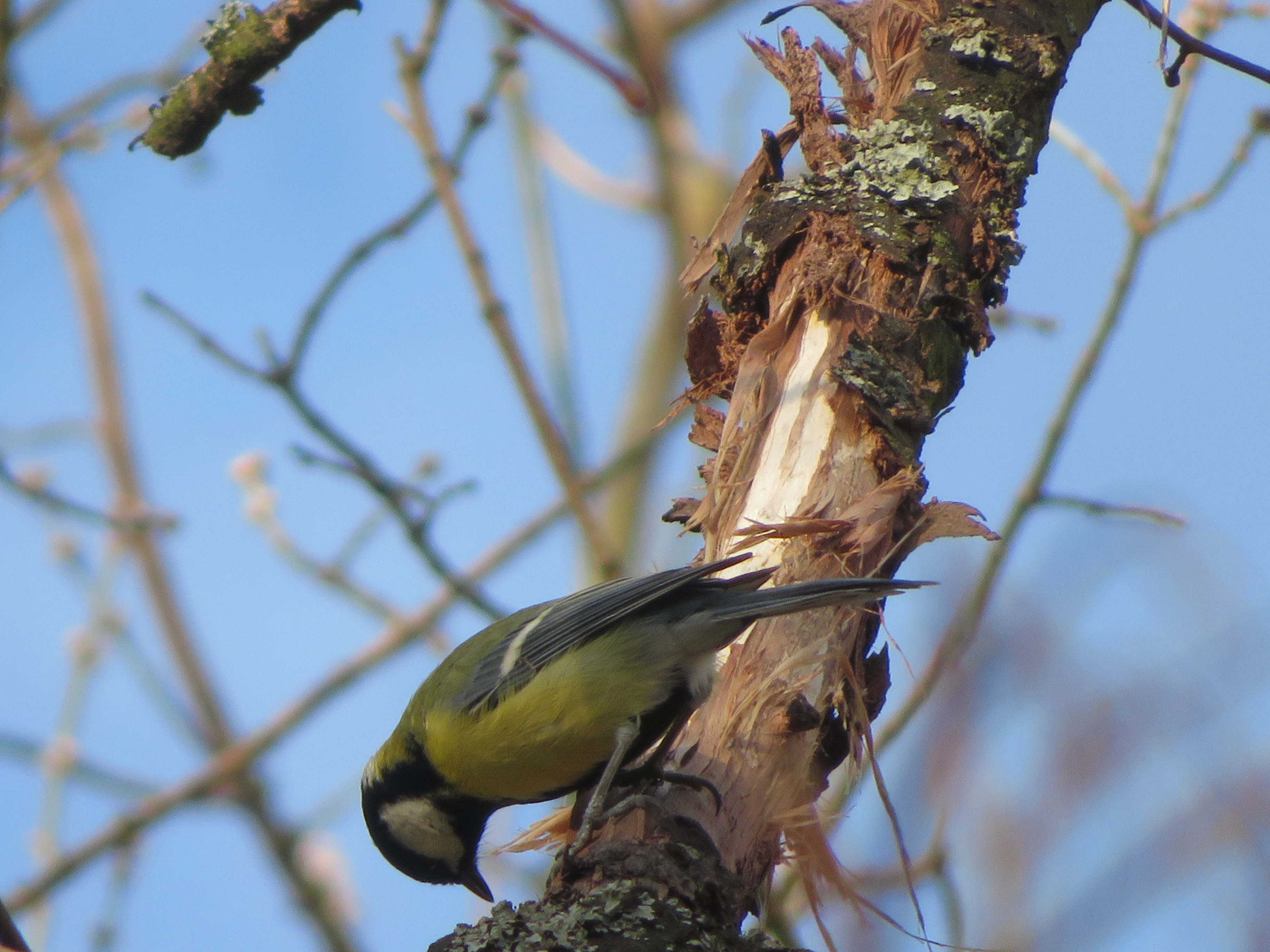 Po chwili z tego samego miejsca na drzewie skorzystała bogatka. I jej przydadzą się drzewne szczapki.